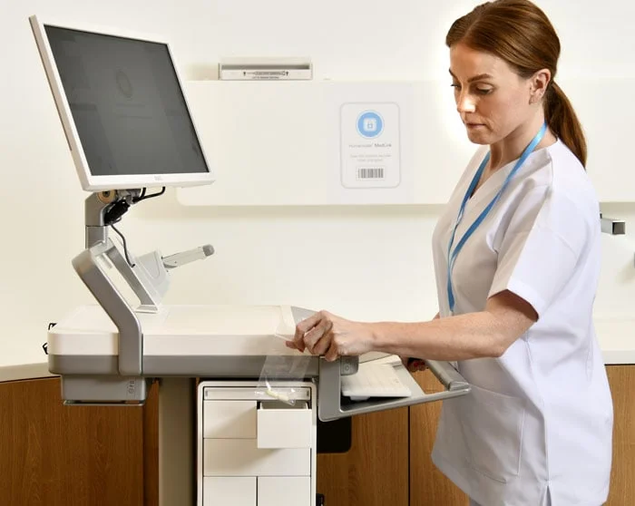 MedLink establishes a closed-loop medication management system by first loading individual drawers with medication at the pharmacy, Automated Dispensing Cabinet (ADC), or nursing station. Subsequently, each drawer is electronically labeled and assigned to a specific patient, ensuring a seamless and error-free medication distribution process.